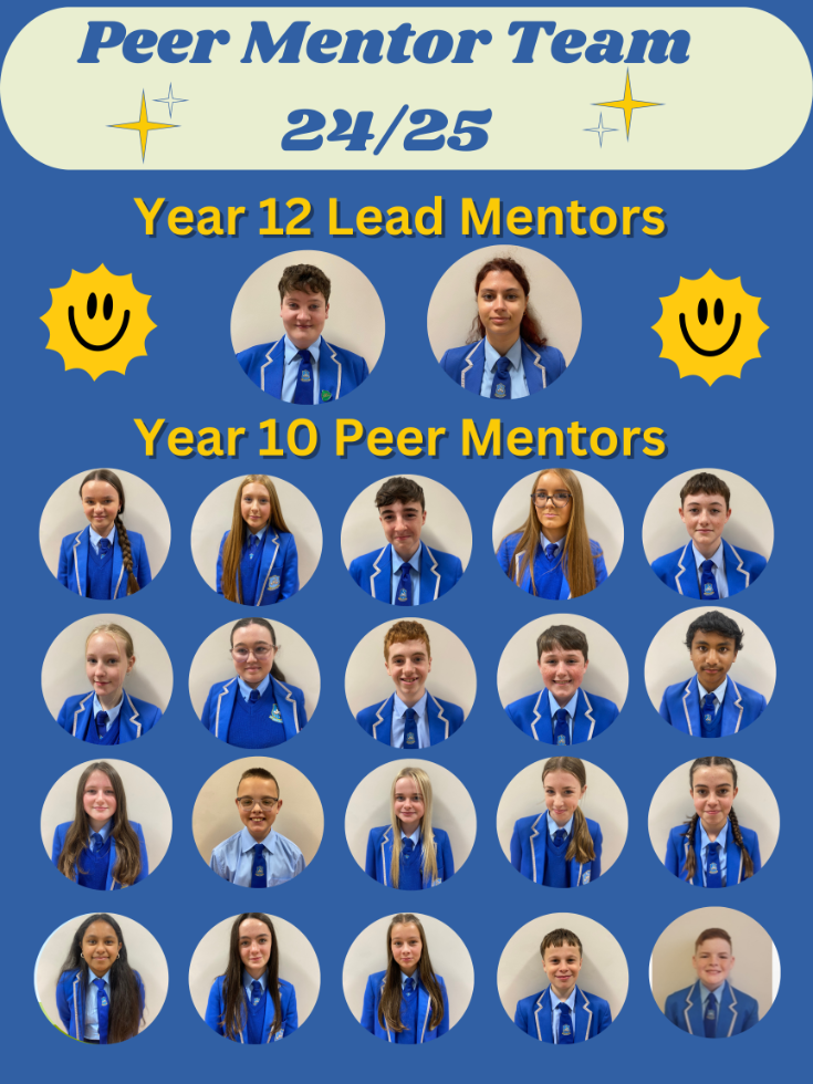 We have Peer Mentors and they are our Year 8 ‘Buddies’. They will be there to help and support you in school. They will take you to your lessons, and to your break and lunch times. You can also ask them any questions you may have.